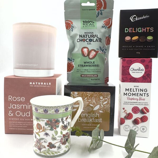 Two of our brand new hampers are the Moet Gold which includes a 200ml bottle of Moet & Chandon, chocolates, fudge and chocolate-coated macadamias, and Luscious Scents containing an aromatherapy diffuser, mist room spray, candle, lip balm, perfume, hand cream, chocolate-covered macadamias, melting moments and tea.